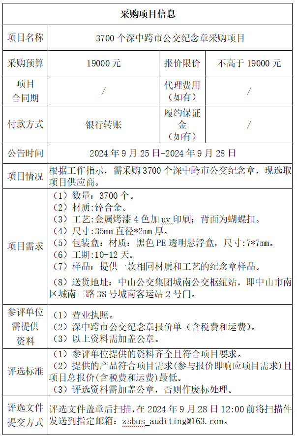 中山市公共交通运输集团有限公司3700个深中跨市公交纪念章采购项目
