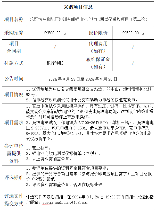 中山市公共交通运输集团有限公司乐群汽车修配厂坦洲车间锂电池充放电测试仪采购项目(第二次)