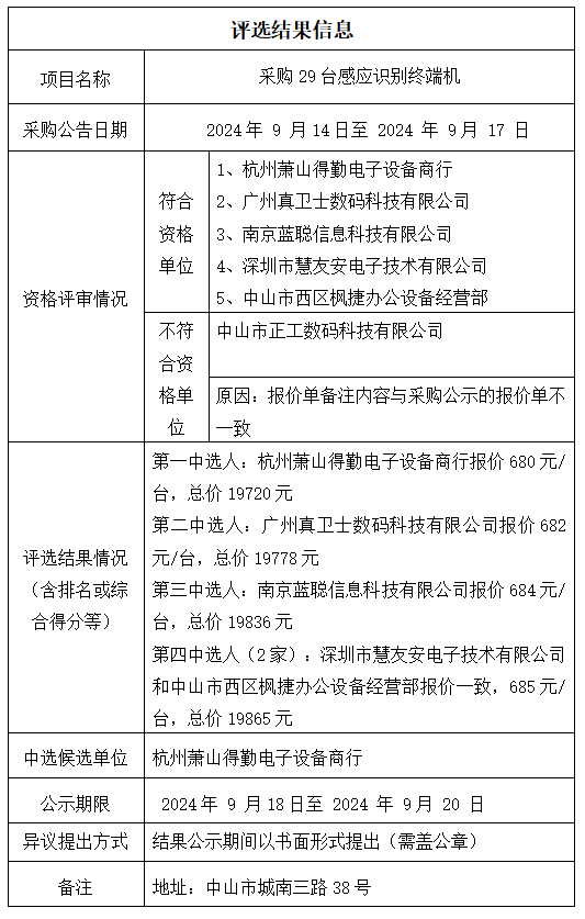中山市公共交通运输集团有限公司采购29台感应识别终端机项目评选结果公示