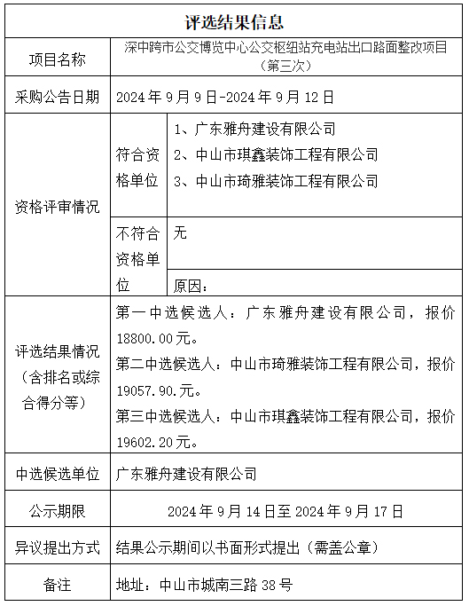 中山市公共交通运输集团有限公司深中跨市公交博览中心公交枢纽站充电站出口路面整改项目(第三次)评选结果公示