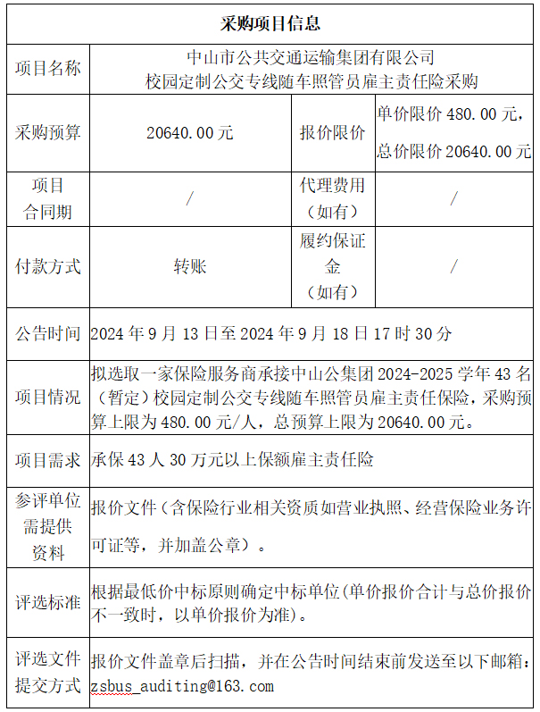 中山市公共交通运输集团有限公司校园定制公交专线随车照管员雇主责任险采购