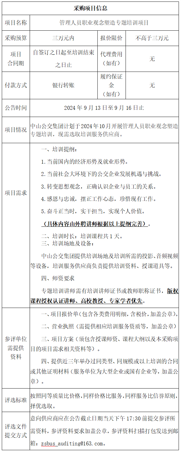中山市公共交通运输集团有限公司管理人员职业观念塑造专题培训项目