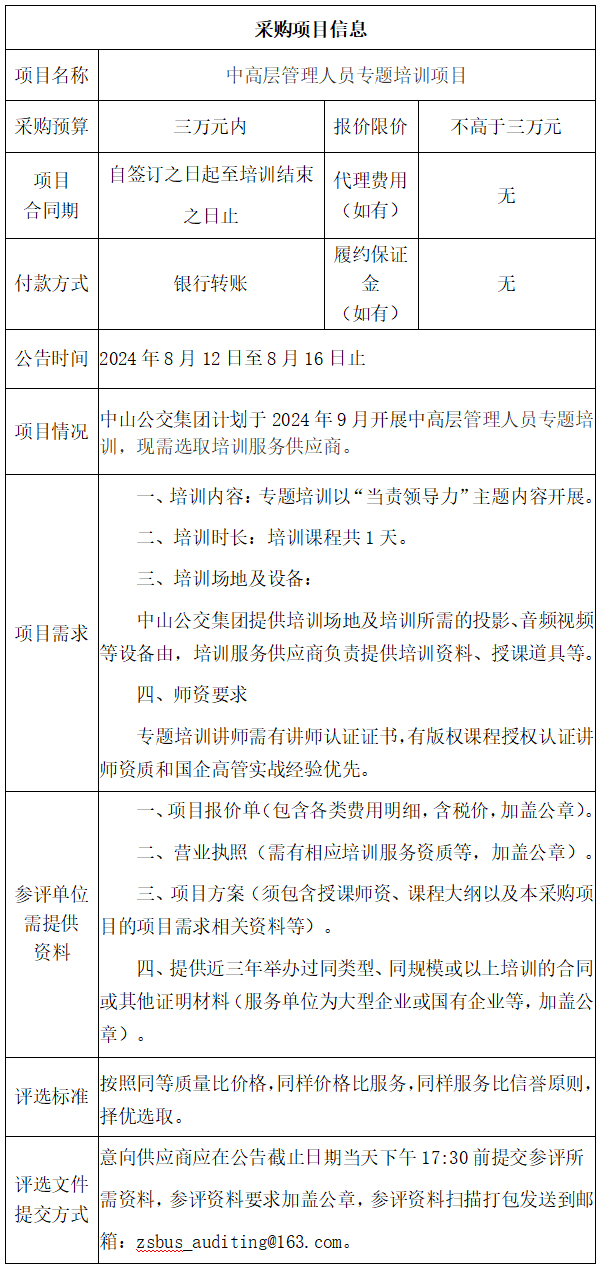 中山市公共交通运输集团有限公司中高层管理人员专题培训项目