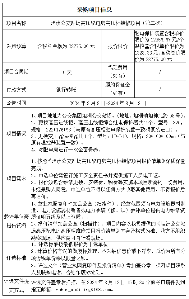 中山市公共交通运输集团有限公司坦洲公交站场高压配电房高压柜维修项目(第二次)