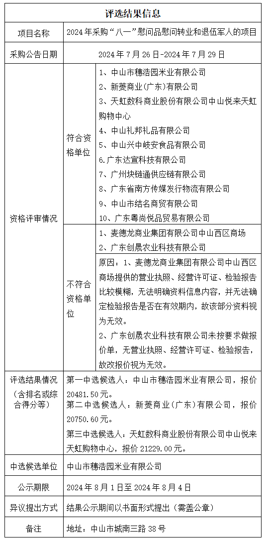 中山市公共交通运输集团有限公司2024年采购“八一”慰问品慰问转业和退伍军人的项目评选结果公示