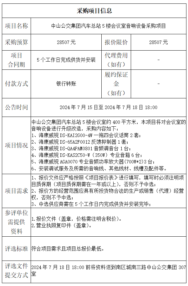 中山市公共交通运输集团有限公司汽车总站5楼会议室音响设备采购项目