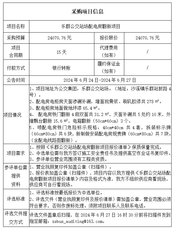 乐群公交站场配电房墙面翻新项目报价清单