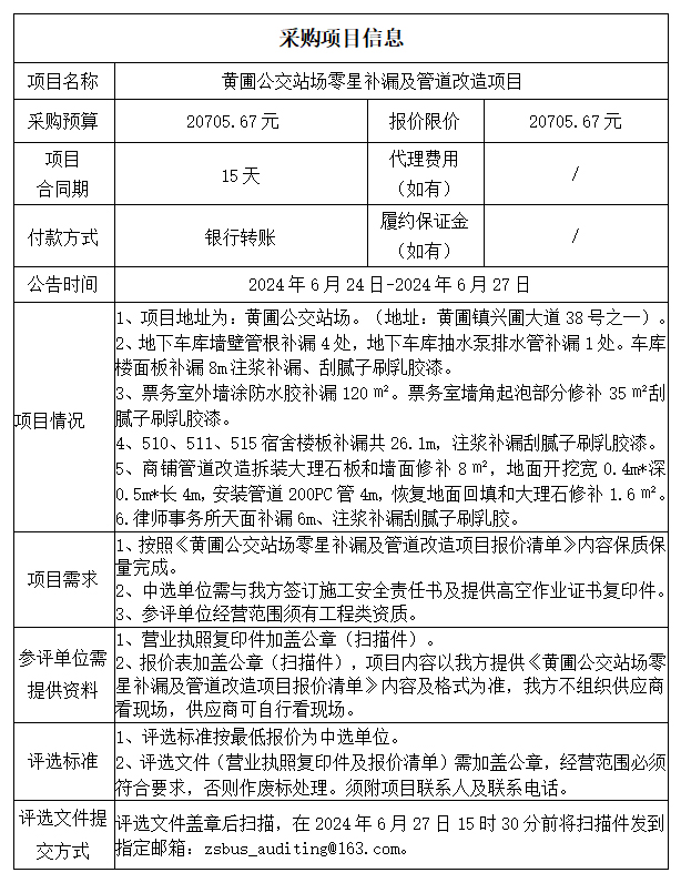 黄圃公交站场零星补漏及管道改造项目报价清单