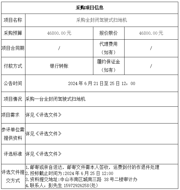 中山市公共交通运输集团有限公司采购全封闭驾驶式扫地机