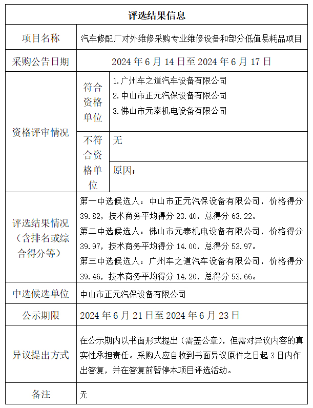 中山市公共交通运输集团有限公司汽车修配厂对外维修采购专业维修设备和部分低值易耗品项目评选结果公示