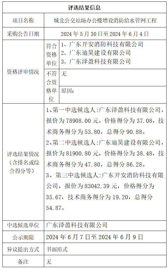 中山市公共交通运输集团有限公司城北公交站场办公楼增设消防给水管网工程项目评选结果公示