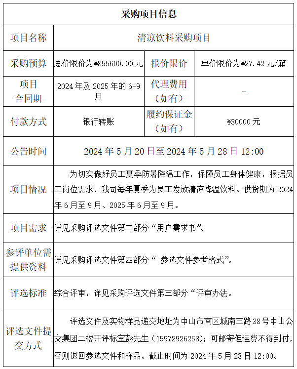 中山市公共交通运输集团有限公司清凉饮料采购项目