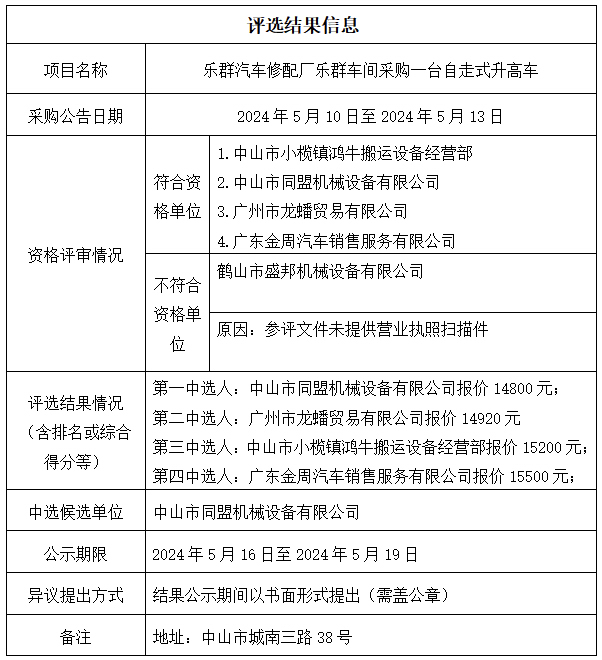 中山市公共交通运输集团有限公司乐群汽车修配厂乐群车间采购一台自走式升高车项目评选结果公示