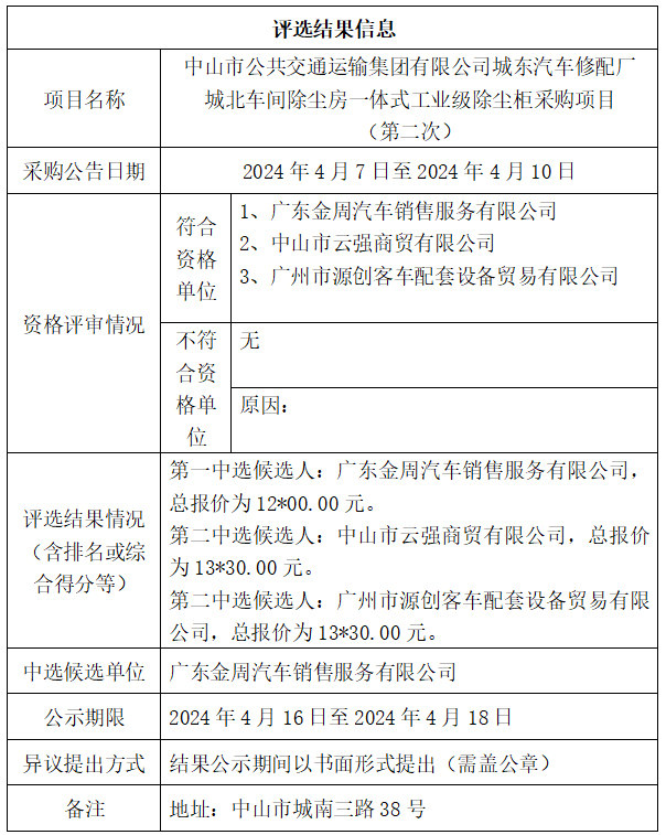 中山市公共交通运输集团有限公司城东汽车修配厂城北车间除尘房一体式工业级除尘柜采购项目(第二次)评选结果公示