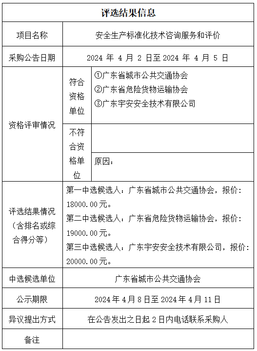 中山市公共交通运输集团有限公司安全生产标准化技术咨询服务和评价评选结果公示