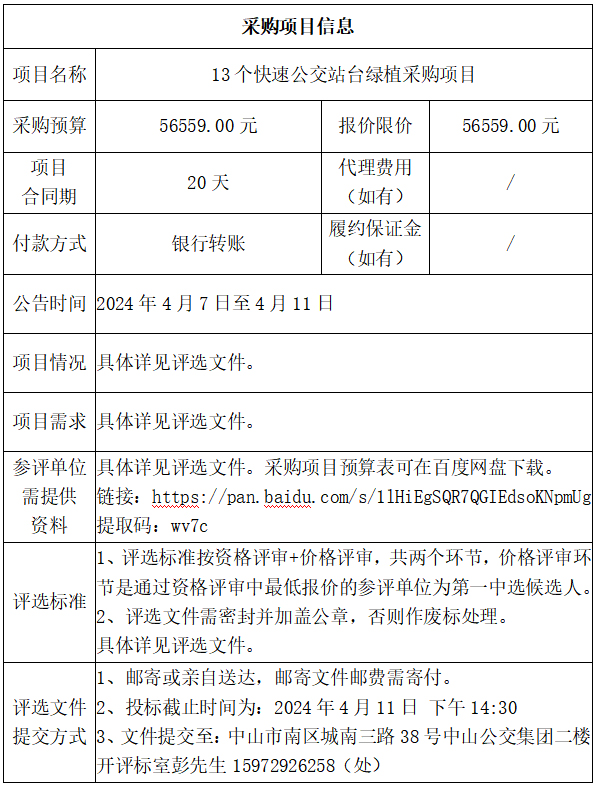 中山市公共交通运输集团有限公司13个快速公交站台绿植采购项目
