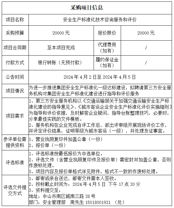 中山市公共交通运输集团有限公司安全生产标准化技术咨询服务和评价