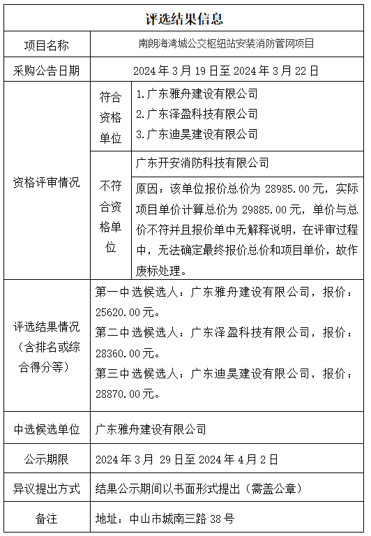 中山市公共交通运输集团有限公司南朗海湾城公交枢纽站安装消防管网项目评选结果公示