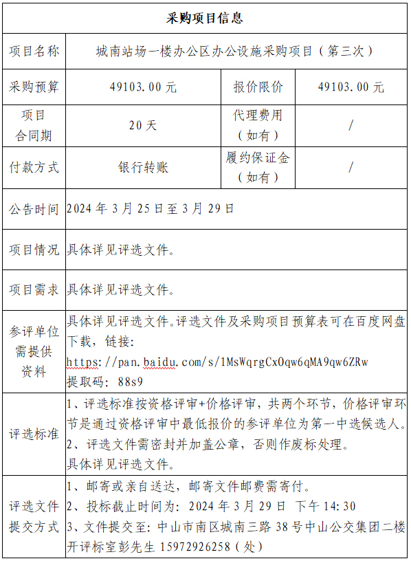 中山市公共交通运输集团有限公司城南站场一楼办公区办公设施采购项目(第三次)
