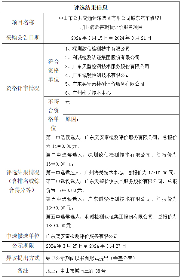 中山市公共交通运输集团有限公司城东汽车修配厂职业病危害现状评价服务项目评选结果公示
