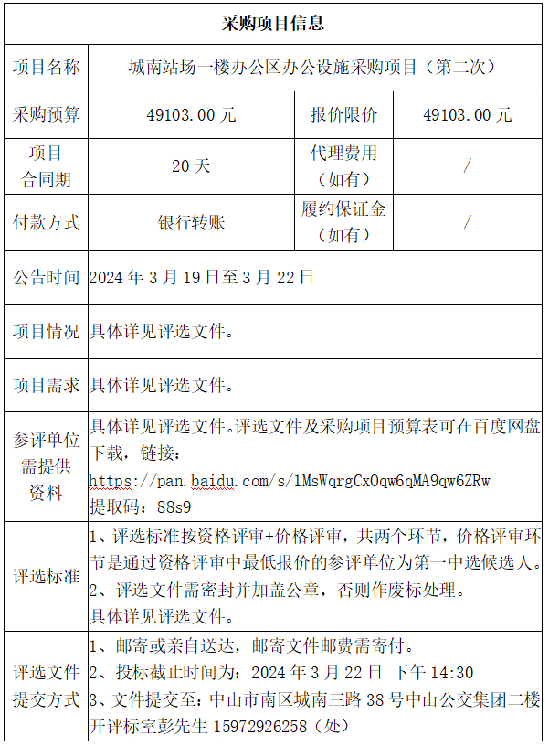 中山市公共交通运输集团有限公司城南站场一楼办公区办公设施采购项目(第二次)