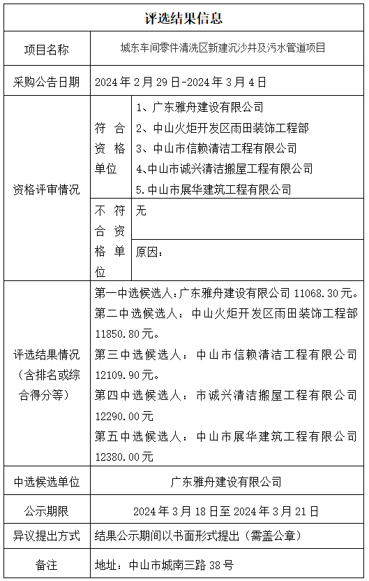 中山市公共交通运输集团有限公司城东车间零件清洗区新建沉沙井及污水管道项目项目评选结果公示