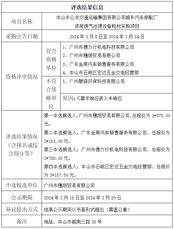 中山市公共交通运输集团有限公司城东汽车修配厂漆房废气治理设备耗材采购项目评选结果公示