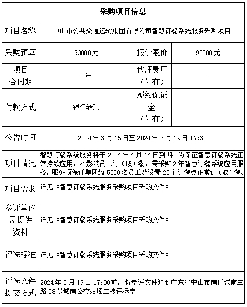 中山市公共交通运输集团有限公司智慧订餐系统服务采购项目