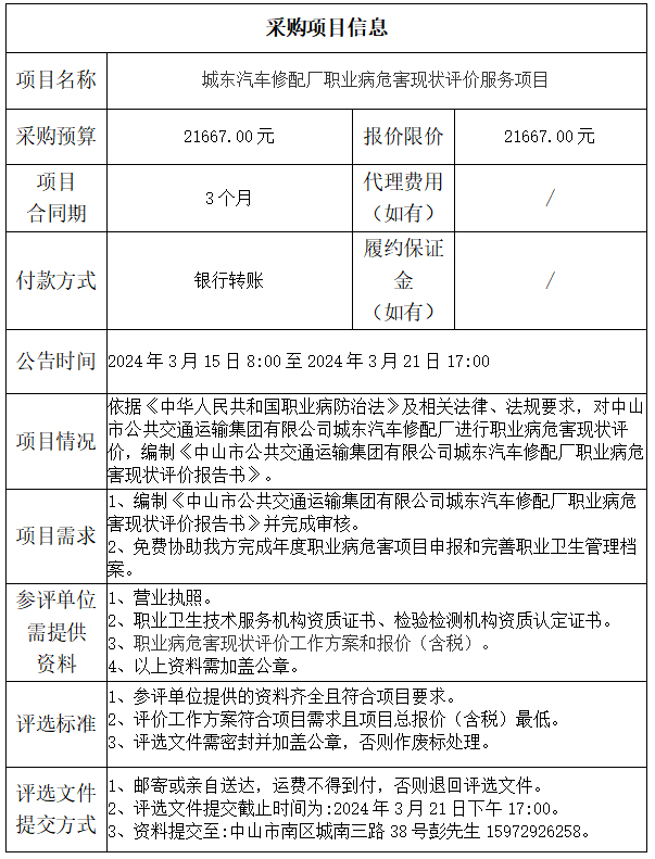 中山市公共交通运输集团有限公司城东汽车修配厂职业病危害现状评价服务项目