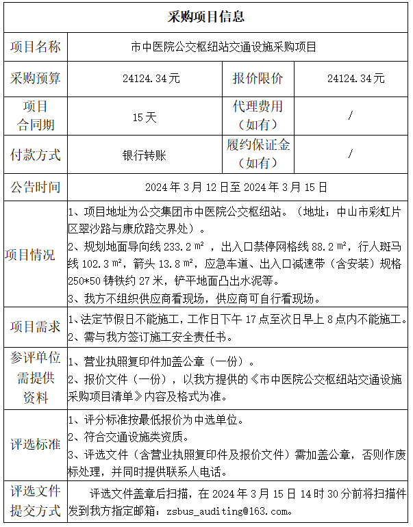 中山市公共交通运输集团有限公司市中医院公交枢纽站交通设施采购项目