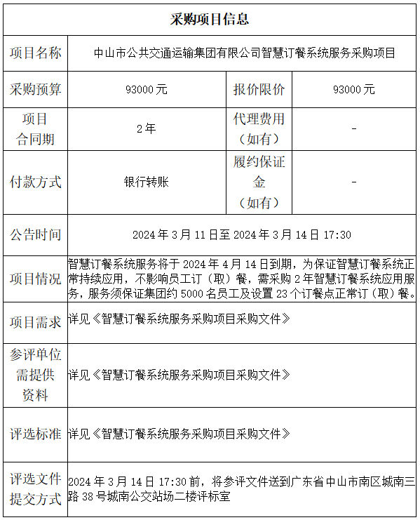 中山市公共交通运输集团有限公司智慧订餐系统服务采购项目
