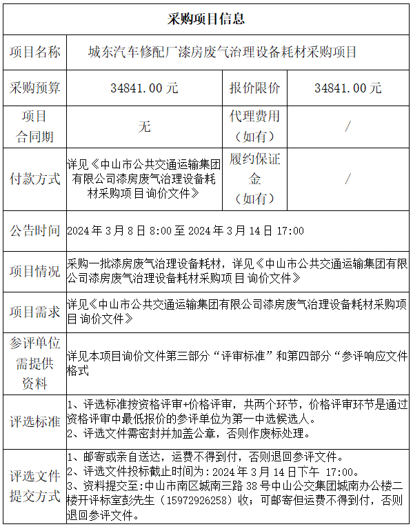 中山市公共交通运输集团有限公司城东汽车修配厂漆房废气治理设备耗材采购项目