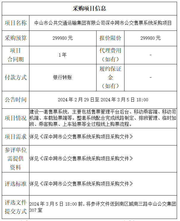 中山市公共交通运输集团有限公司深中跨市公交售票系统采购项目