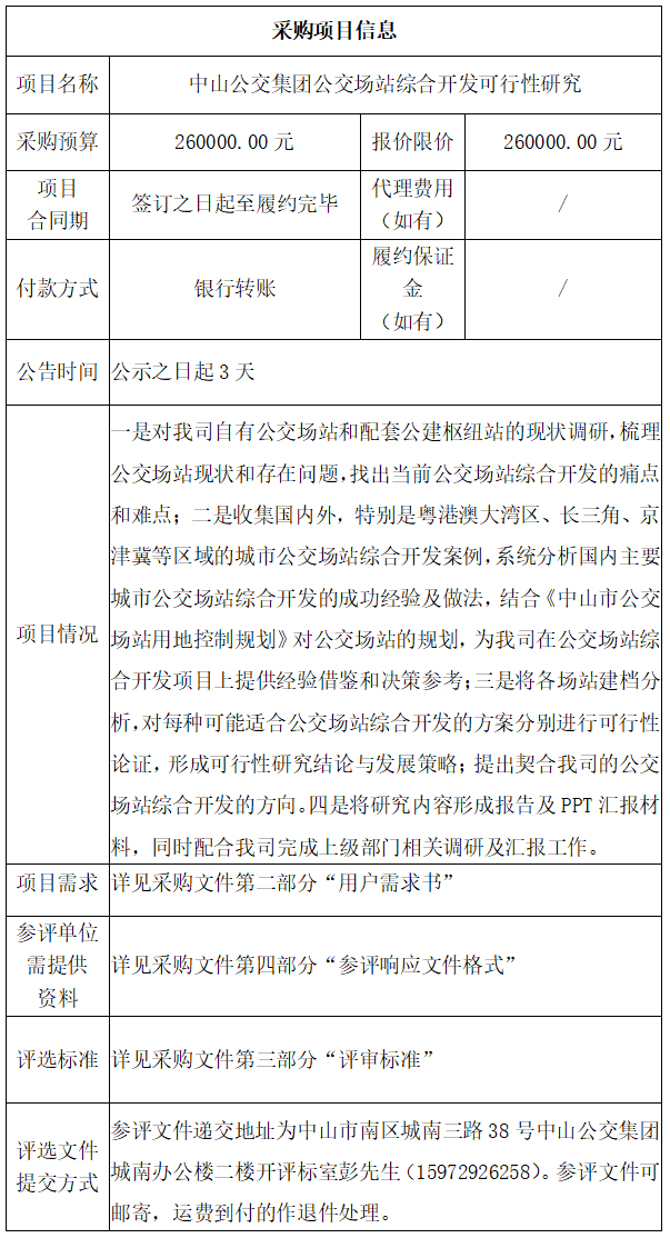 中山公交集团公交场站综合开发可行性研究项目(采购文件)