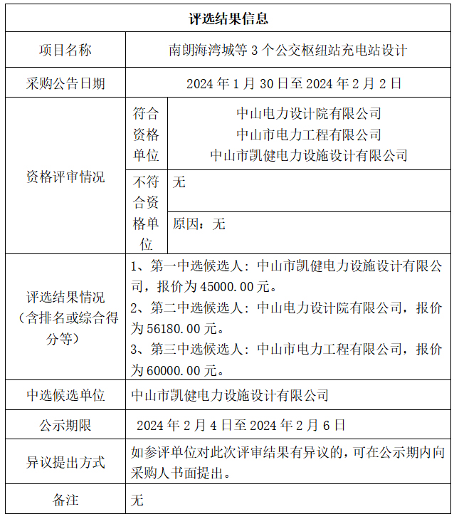中山市公共交通运输集团有限公司南朗海湾城等3个公交枢纽站充电站设计项目评选结果公示
