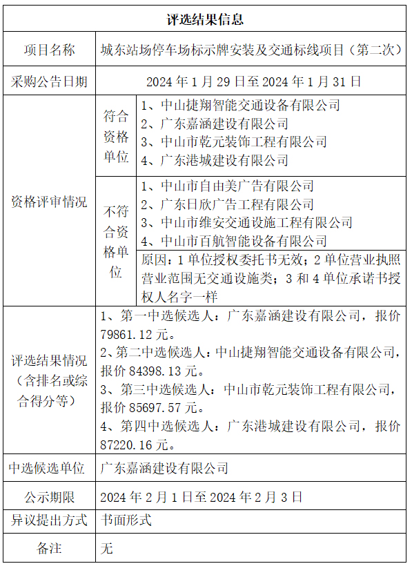 中山市公共交通运输集团有限公司城东站场停车场标示牌安装及交通标线项目(第二次)项目评选结果公示