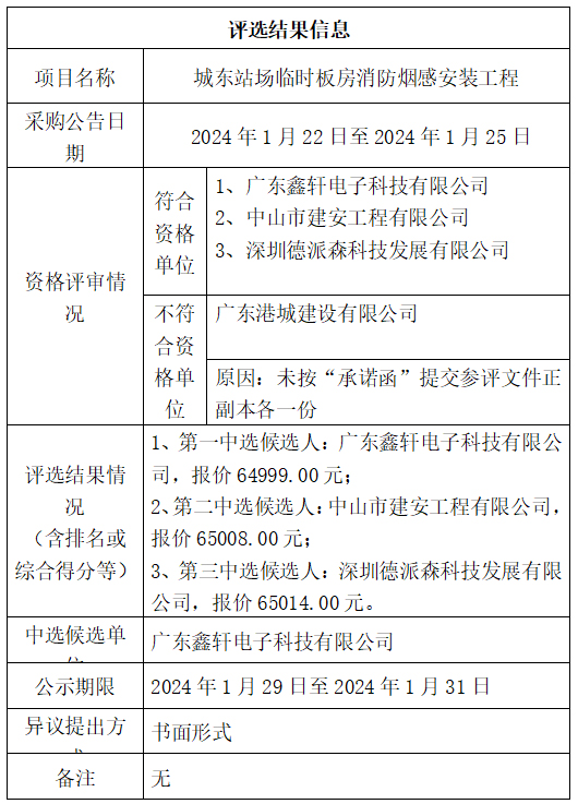 中山市公共交通运输集团有限公司城东站场临时板房消防烟感安装工程项目评选结果公示