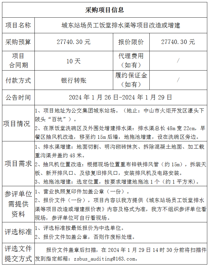 中山市公共交通运输集团有限公司城东站场员工饭堂排水渠等项目改造或增建