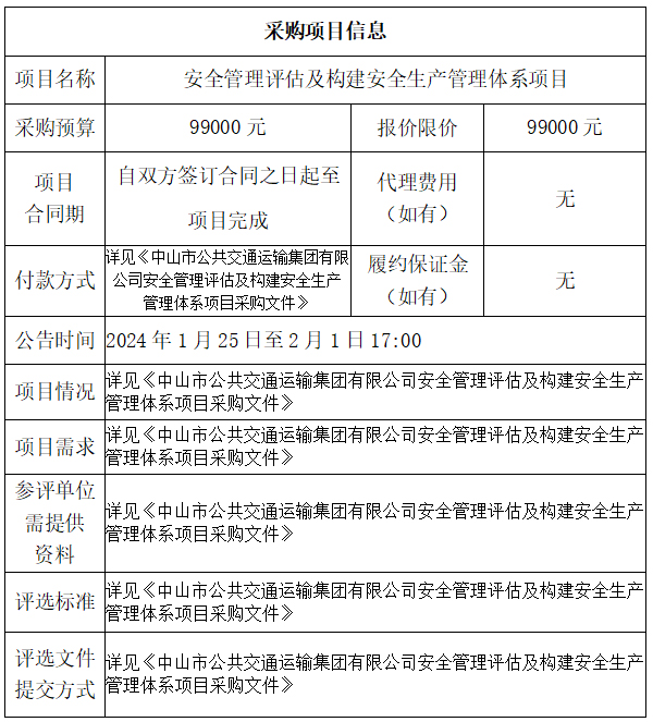 中山市公共交通运输集团有限公司安全管理评估及构建安全生产管理体系项目