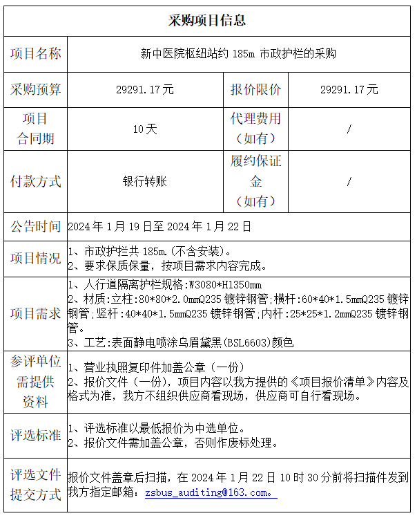 中山市公共交通运输集团有限公司新中医院枢纽站约185m 市政护栏的采购项目