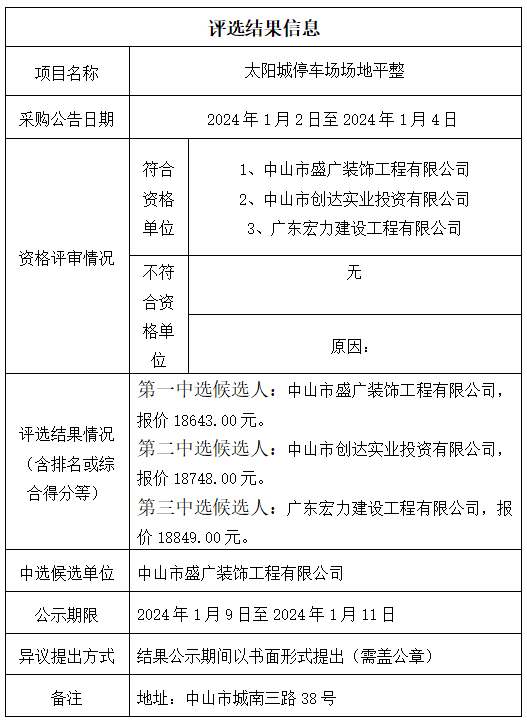 中山市公共交通运输集团有限公司太阳城停车场场地平整项目评选结果公示
