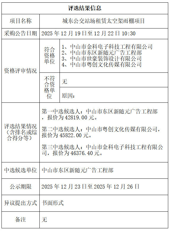 中山市公共交通运输集团有限公司城东公交站场租赁太空架雨棚项目评选结果公示
