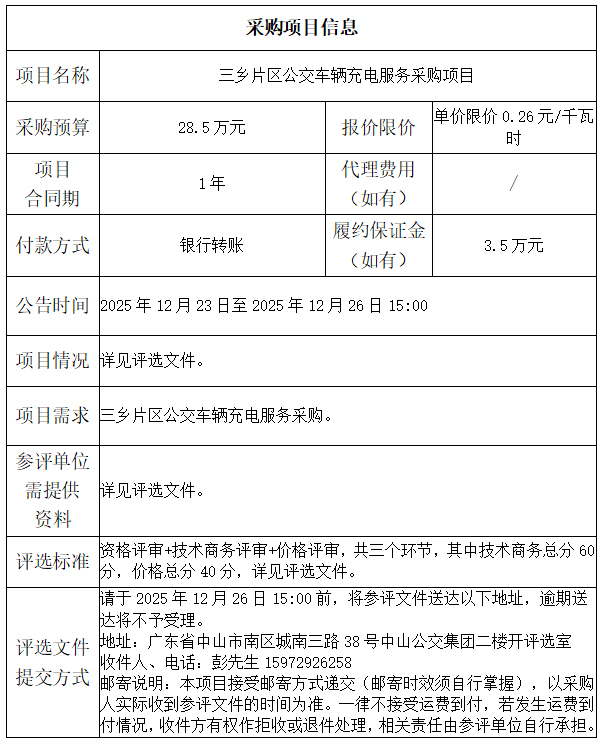 中山市公共交通运输集团有限公司三乡片区公交车辆充电服务采购项目
