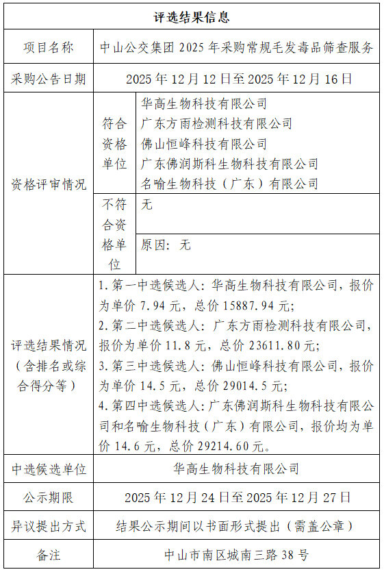 中山市公共交通运输集团有限公司2025年采购常规毛发毒品筛查服务项目评选结果公示