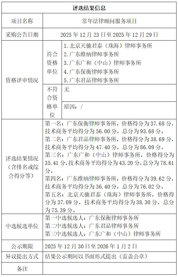 中山市公共交通运输集团有限公司常年法律顾问服务项目评选结果公示