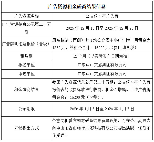 中山市香山畅行文化科技有限公司广告资源租金磋商结果公示