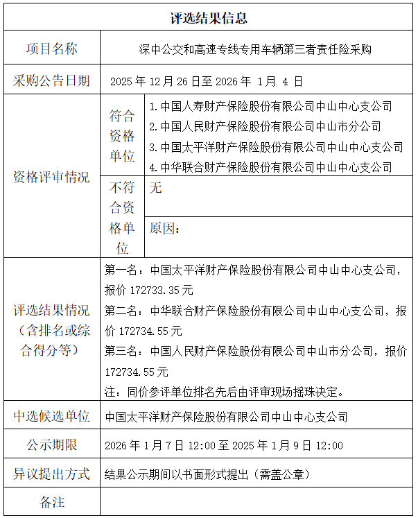中山市公共交通运输集团有限公司深中公交和高速专线专用车辆第三者责任险采购项目评选结果公示