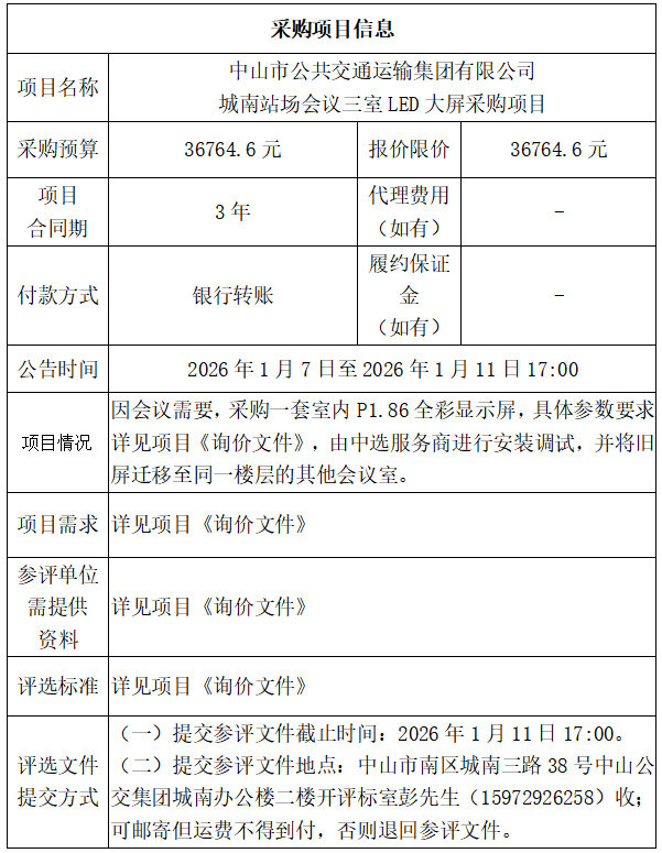 中山市公共交通运输集团有限公司城南站场会议三室LED大屏采购项目