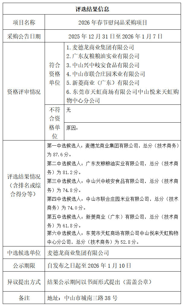 中山市公共交通运输集团有限公司2026年春节慰问品采购项目评选结果公示