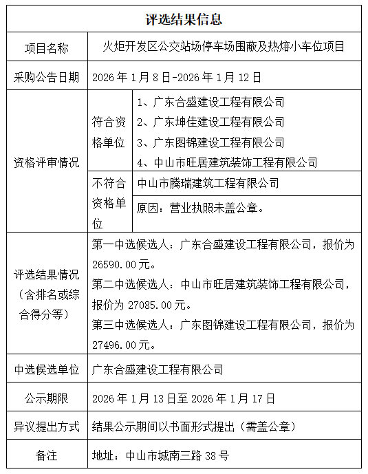 中山市公共交通运输集团有限公司火炬开发区公交站场停车场围蔽及热熔小车位项目评选结果公示
